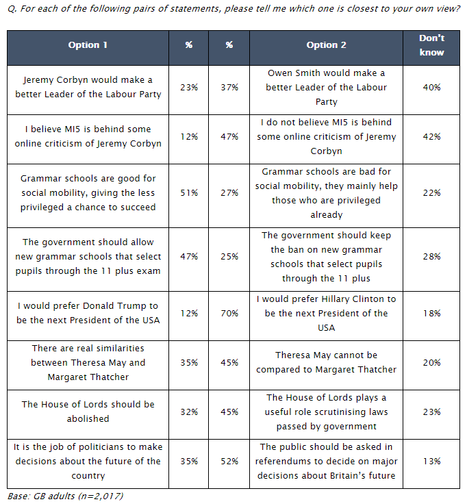 ComRes interviewed 2,017 GB adults online 10-12 August 2016. Data were weighted to be demographically representative of all GB adults. ComRes is a member of the British Polling Council. ComRes is not publishing voting intention while it reviews its methods. Full tables on the ComRes website.