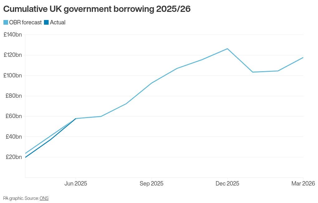Borrowing for the first three months of the financial year to date stood at £57.8bn, £7.5bn more than the same three-month period in 2024, according to the ONS.