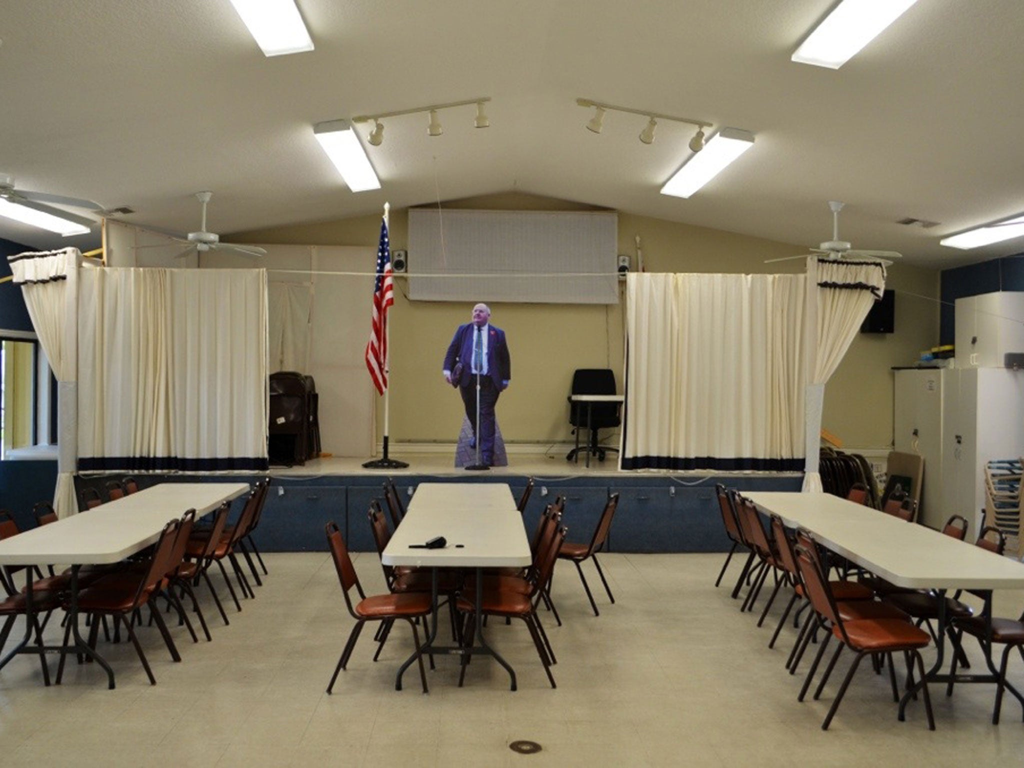 British students taking cardboard cutout of Local Communities and Government Secretary around the States