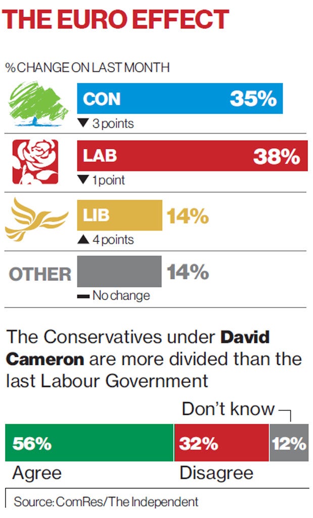 The divisions that opened up in last week's rebellion by 81 Tory MPs appear to be damaging the party's standing with voters: according to ComRes, Labour has doubled its lead to four points since the last survey two weeks ago. The Tories have slipped three points to 34 per cent, while Labour is down one to 38 per cent and the Liberal Democrats are up four to 14 per cent. Other parties are unchanged on 14 per cent. A month ago, the Tories enjoyed a one-point lead over Labour.