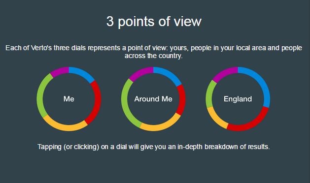 Verto will not only generate a picture of where your own political views lie, but also the view of people who live in your local area and across the country you select.