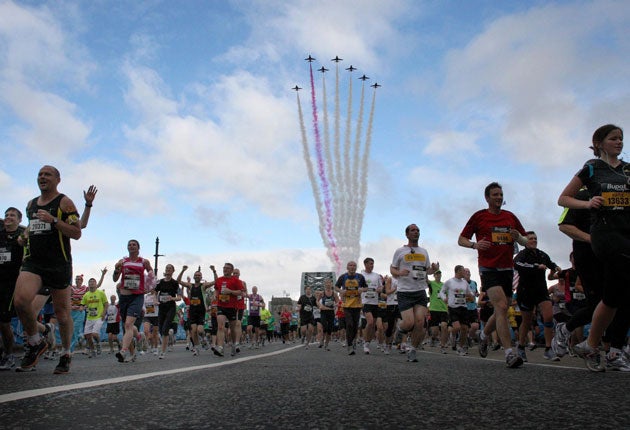 The Red Arrows fly over the Tyne Bridge as runners take part in the Bupa Great North Run in Newcastle. Dr Emma Egging, the widow of Flight Lieutenant Jon Egging, the Red Arrows pilot killed in a display last month, started the race in which more than 54,000 people took part. She wore the number four in tribute to her husband, who flew as Red 4.