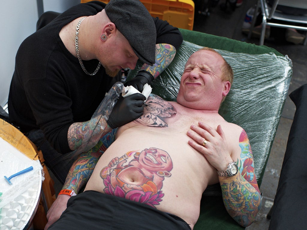 When the comedian Harry Hill fronted an advert for T-Mobile earlier this year called "What Britain Loves", he proudly stated that Britain loves gardening, marching bands, nostalgia and – er – tattoos. One person who would not disagree with him is Stacey Evans. Sitting in a corner, facing the wall, she is an object of stillness amid a blur of mohicans, burlesque artists, BMX dancers and scores of inked arms, legs and torsos at London's Olympia exhibition hall, hosting the Great British Tattoo Show, believed to be the country's biggest ever.
