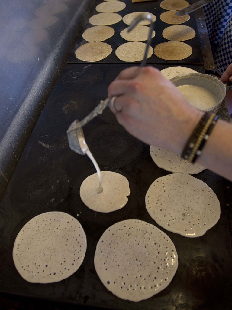 The Hole in the Wall is an ordinary red-brick, end-of-terrace house. But it has become famous for keeping to an age-old tradition, selling from its front window the pancake-style oatcakes, which are synonymous with North Staffordshire – and not to be confused with the Scottish biscuits that share the same name. With its aerated, floppy texture, the Staffordshire snack is more akin to a French galette and is served filled with bacon, sausage or cheese – or all three.