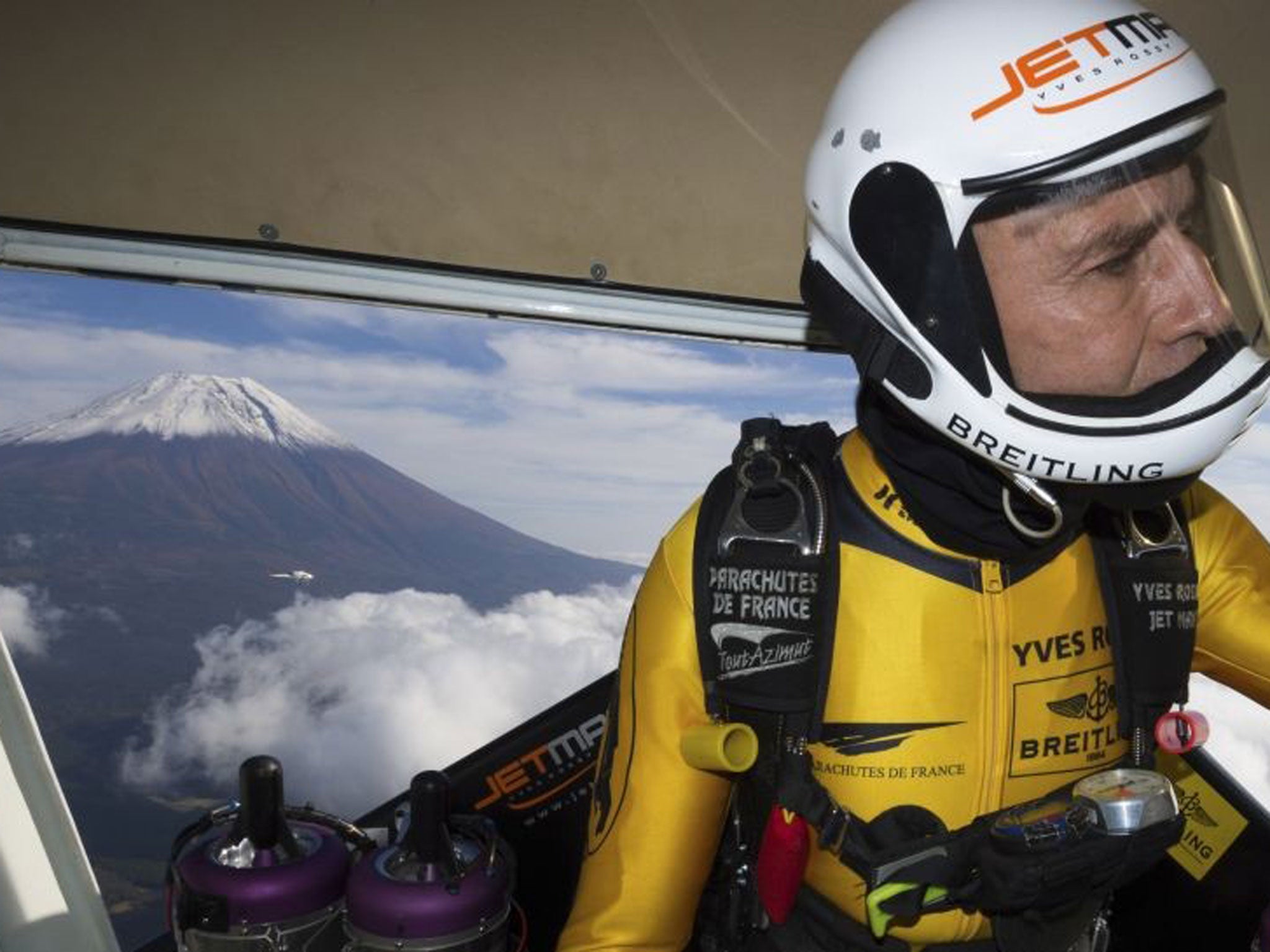 Yves Rossy soared over Japan's iconic landmark Mount Fuji using jet-powered wings attached to his body.