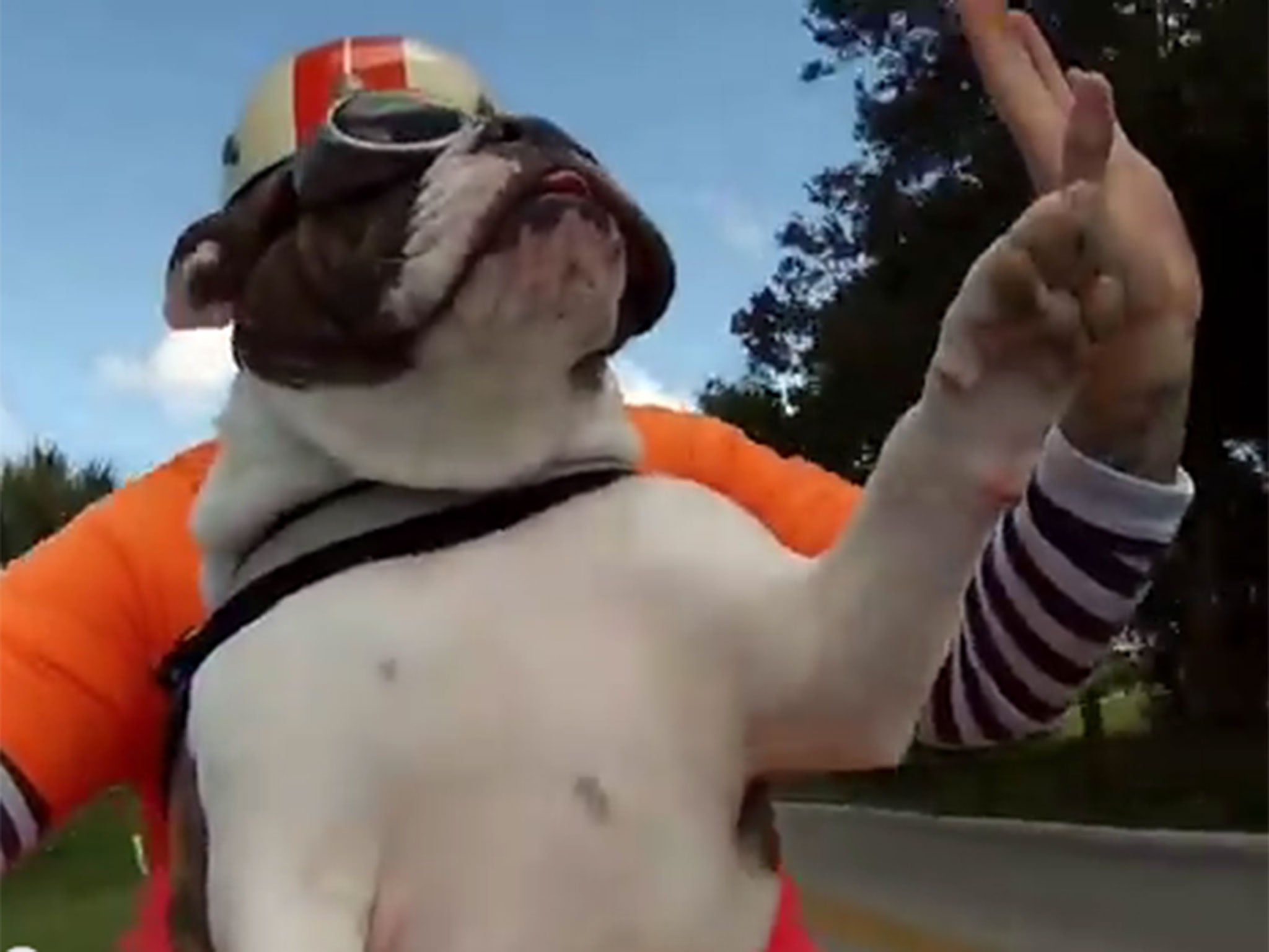 Riding a motorcycle and wearing  goggles, this adorable bulldog waves to another bike that passes by.