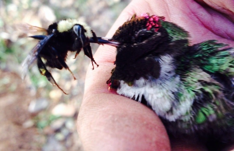 A bumblebee and a hummingbird impaled each other to death simultaneously as if filming a kung fu movie