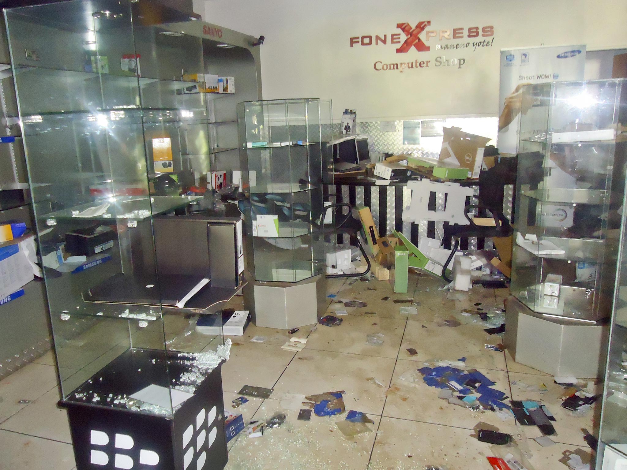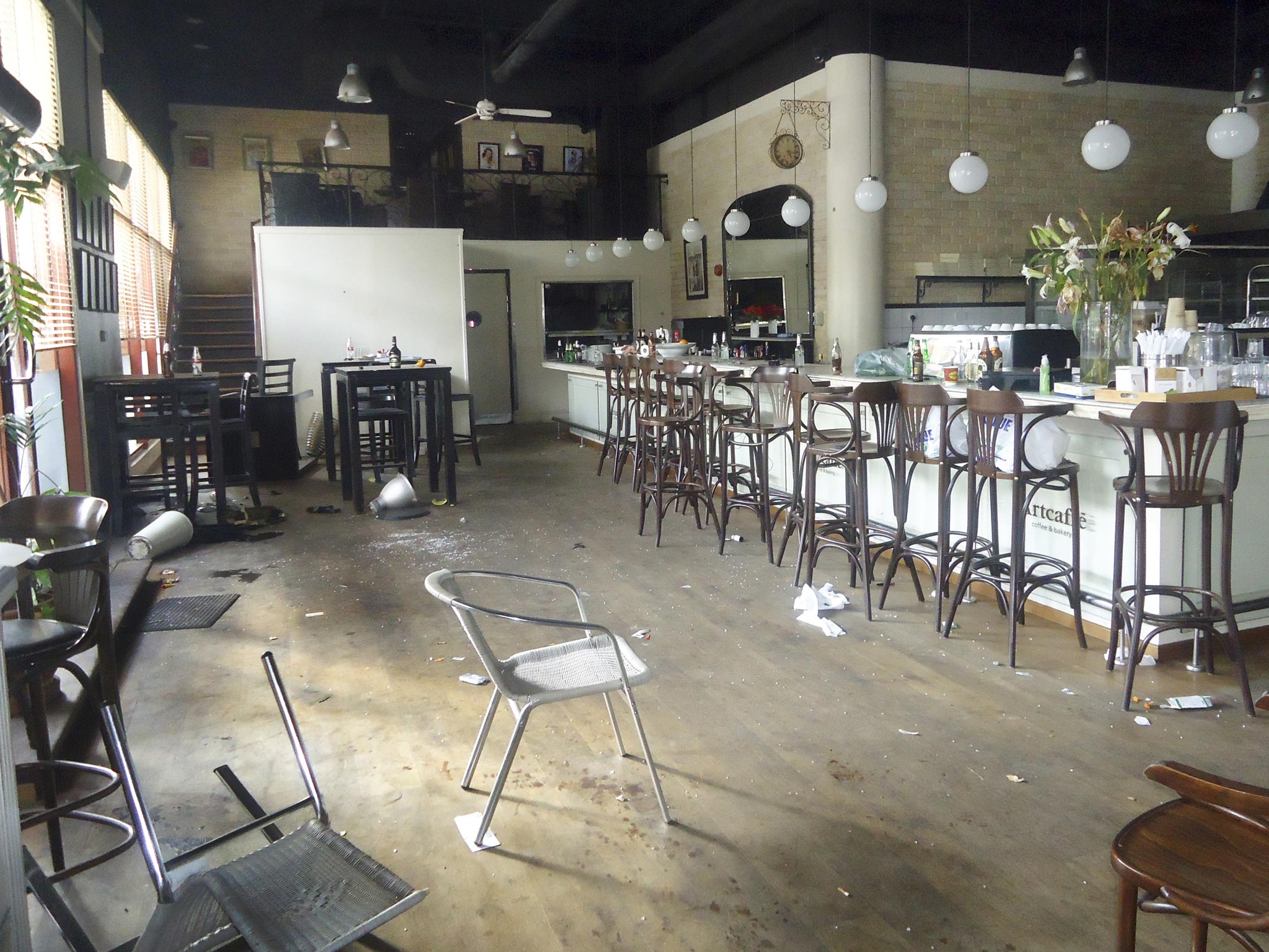 The images show shopping trolleys full of grocery bags lying abandoned in hall ways while half full beer bottles stand discarded on restaurant tables. The eerie images reveal the panic faced by the shoppers as they attempted to flee from the shopping mall.