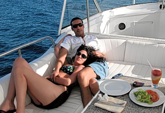 Some of the pictures on the laptop were taken at another party, in Cairo, with belly dancers and a well known Egyptian singer providing the entertainment. Aline Skaf sits arms entwined with her husband, with a bruise on her face.