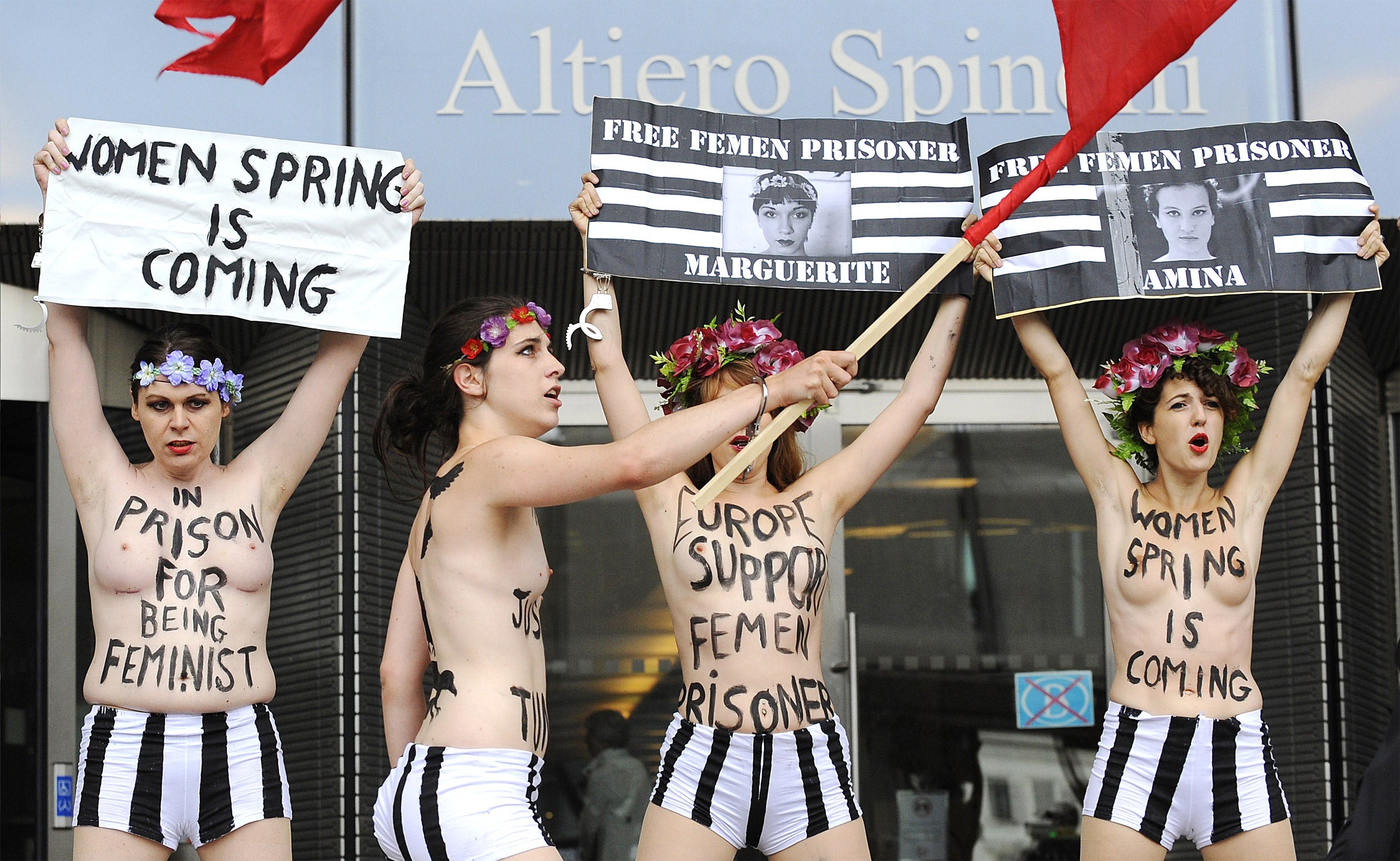 The women first appeared in court last Wednesday when two French lawyers also flew in to assist with the case. However the trial was adjourned and the women were denied bail. The French lawyers did not return for the hearing today but said last week that they would fly back immediately if the women were not released. The case has also been attracting international attention with three other members of Femen protesting topless today outside the Tunisian Embassy in Madrid in defence of the three women.