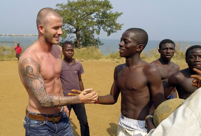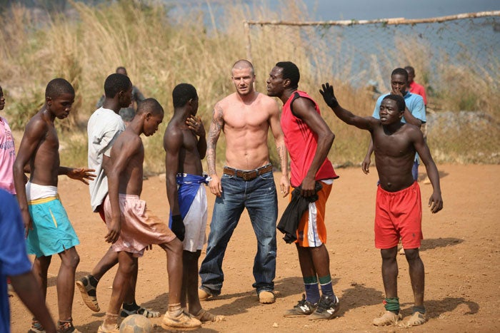 The former England captain is having a kickabout with some residents of Freetown, Sierra Leone, and affecting one of his trademark poses: top off, tattoos on display, expensive designer clobber worn in reassuringly casual fashion (though surely Timberland boots went out with Vanilla Ice).