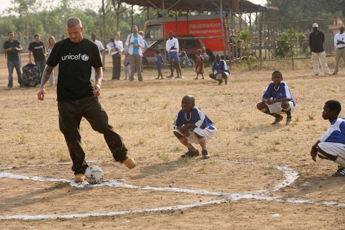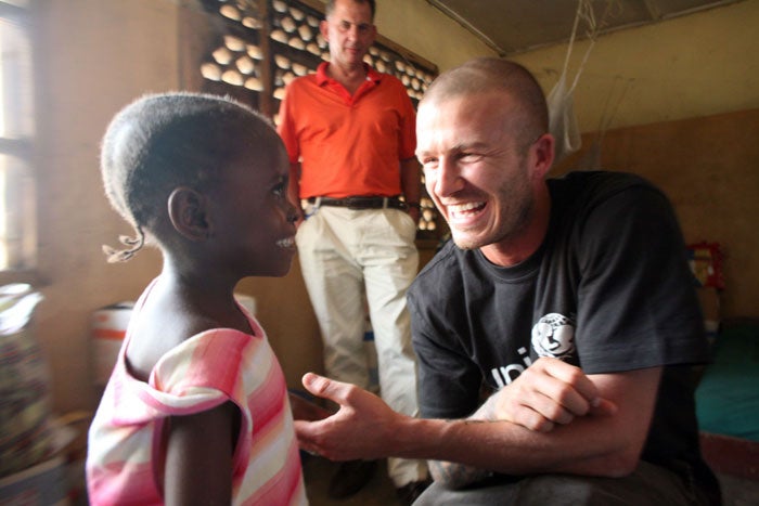 Splendidly, this is not a competition in a tabloid newspaper, but a picture of David Beckham acting in his capacity as a "goodwill ambassador" for the UN children's organisation, Unicef.