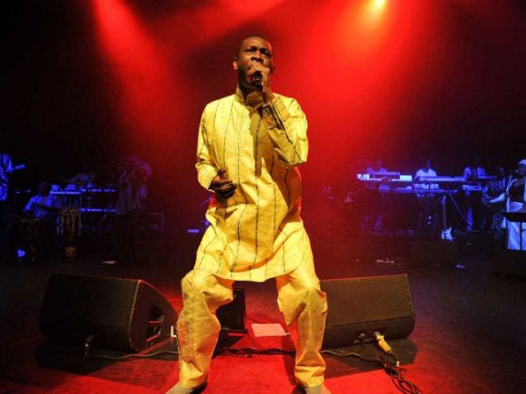 Youssou N'Dour was having trouble striking a pose. With no microphone in front of him he seemed unsure what to do with his hands, eventually opting to fold his arms and glare down the street at the police.