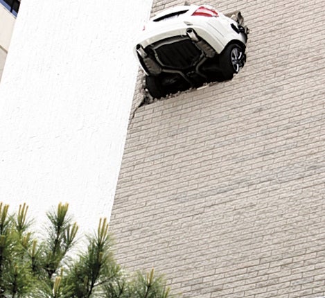 The car burst through the building's exterior wall, showering debris on a parking lot below before stopping just in time. The car's boot and part of its back wheels were left hanging precariously out of the building but officials were able to safely drive it back inside.