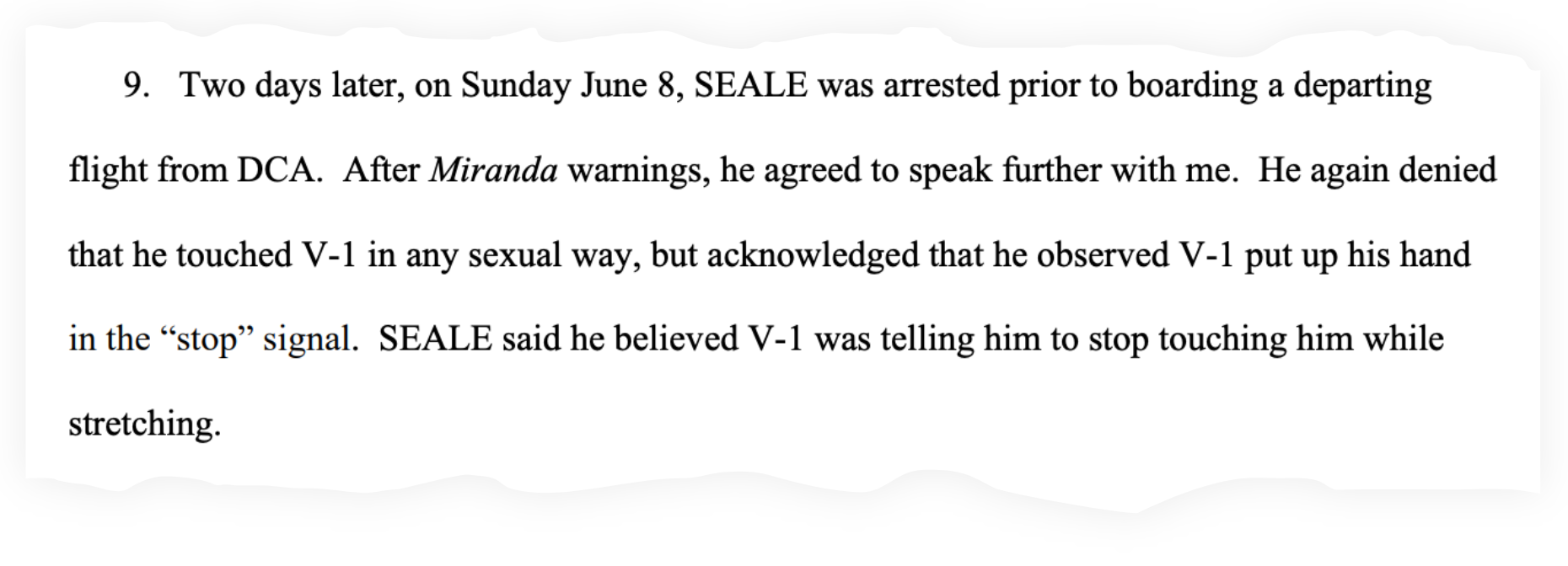 He “acknowledged sitting next to” the alleged victim, and admitted to “possibly making contact with him while stretching his arms,” the affidavit states. At the same time, it says Seale “denied ever touching him in a sexual way and denied ever exposing his own genitalia.”