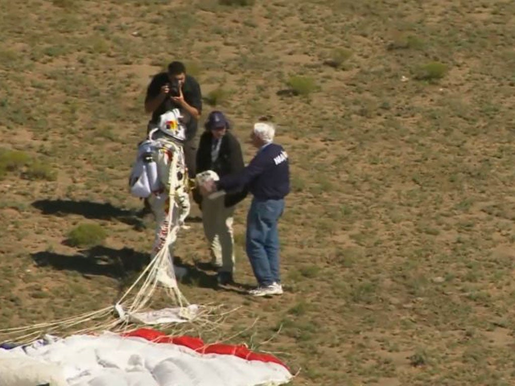 By the time Baumgartner stepped onto his tiny balcony to take in a view few men will see, hearts raced as fast as his. He stood and then he fell, quickly shrinking to the size of a pinprick.