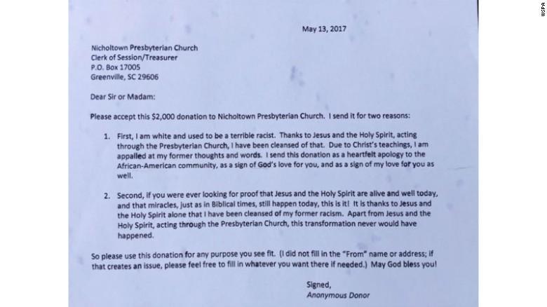 In an anonymous letter to Nicholtown Presbyterian Church, the person said they were sending the donation “as a heartfelt apology to the African American community, as a sign of God's love for you and as a sign for my love for you as well.”