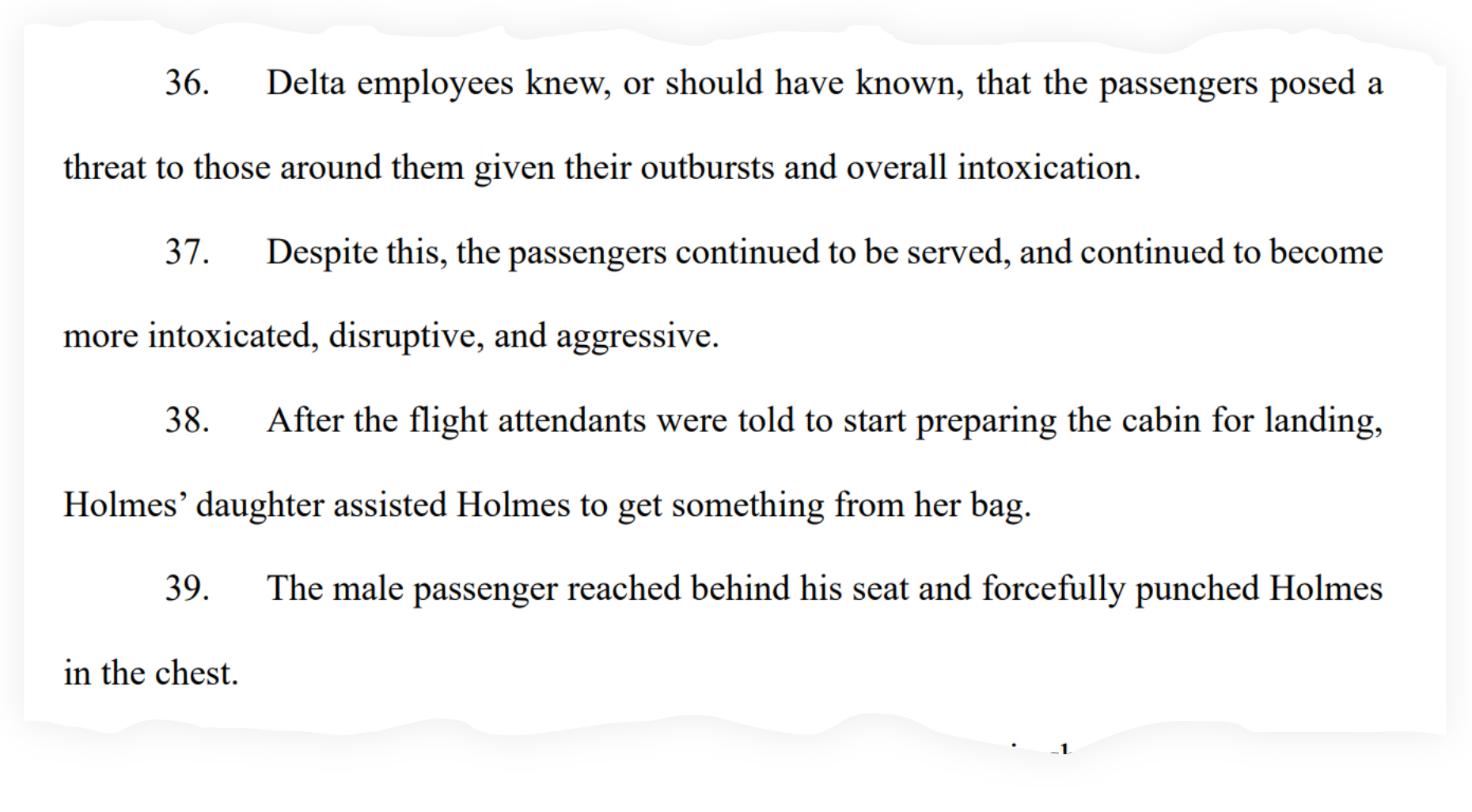 Holmes’ complaint claims Delta has a record of overserving passengers, “leading to foreseeable assaults.” It goes on to list four separate incidents in which drunk passengers attacked others, spanning from 2016 to 2023. Of 915 reported incidents involving unruly fliers over the first six months of 2024, the Federal Aviation Administration attributed 106 of them to intoxication.