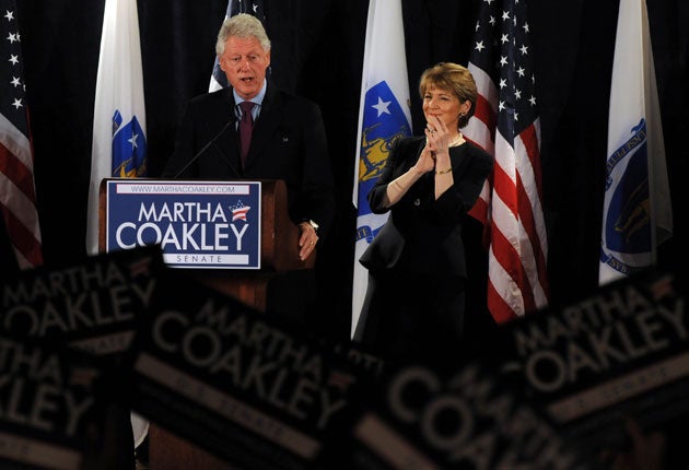 It may not be too late. "In the past 24 hours, the lights have come on," Ellen Malcolm, the founder of Emily's List, which supports women candidates who back abortion rights, said while campaigning with Ms Coakley at the weekend. "Democrats have woken up.'' Since Friday she has also been joined on the trail by other party stars, including former President Bill Clinton and the state's senior Senator, John Kerry.