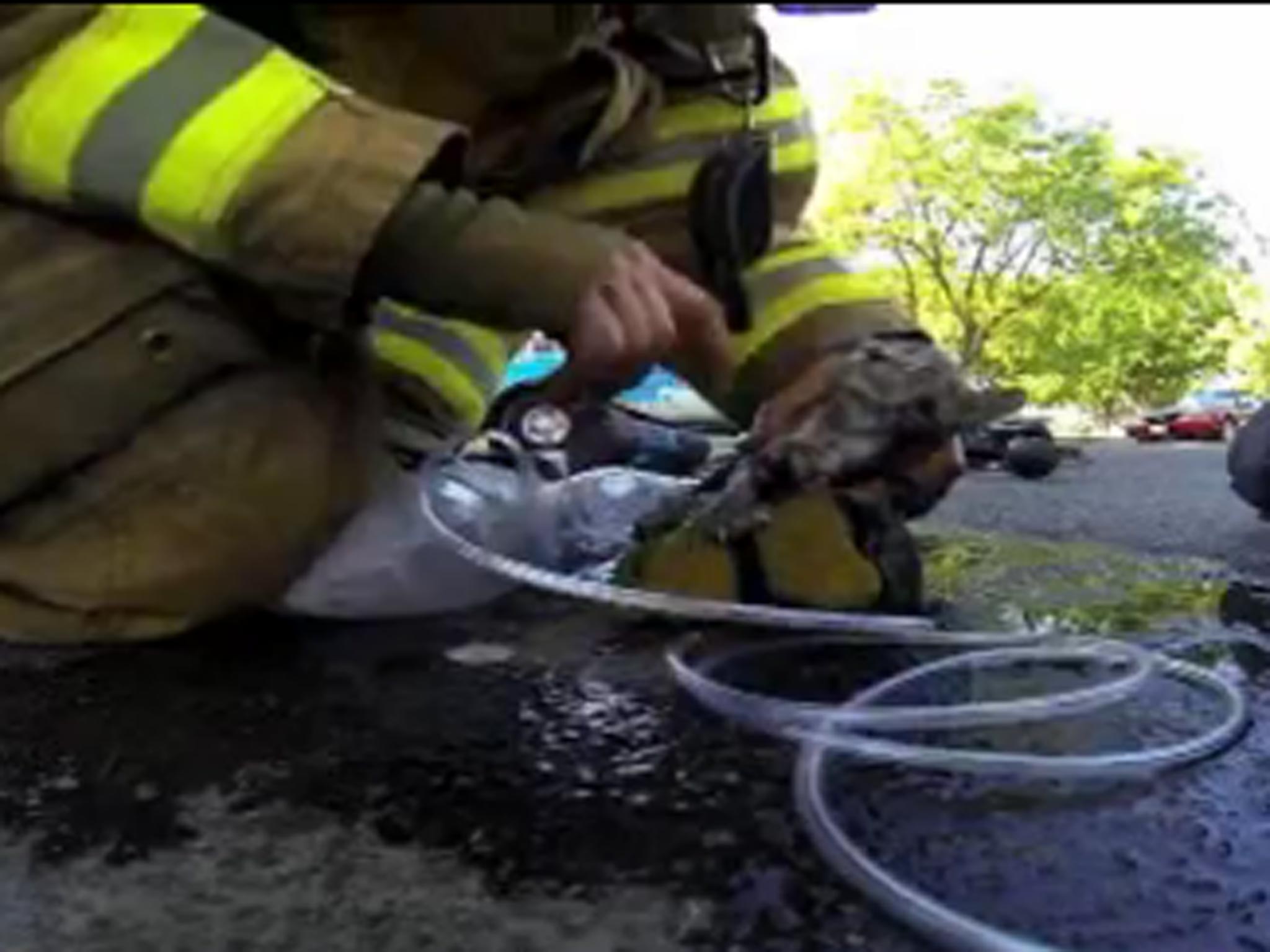 Firefighter massages kitten back to life after lifeless animal is left in a burnt-out house