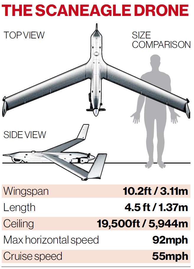 Both Iran and the US have been jostling to show off their military capability around the Straits of Hormuz, part of the shipping route for about 40 per cent of all the world’s seaborne crude oil exports. The drone appeared to be a Boeing ScanEagle. About 4ft long, it can be launched by catapult from small ships and is used for reconnaissance.