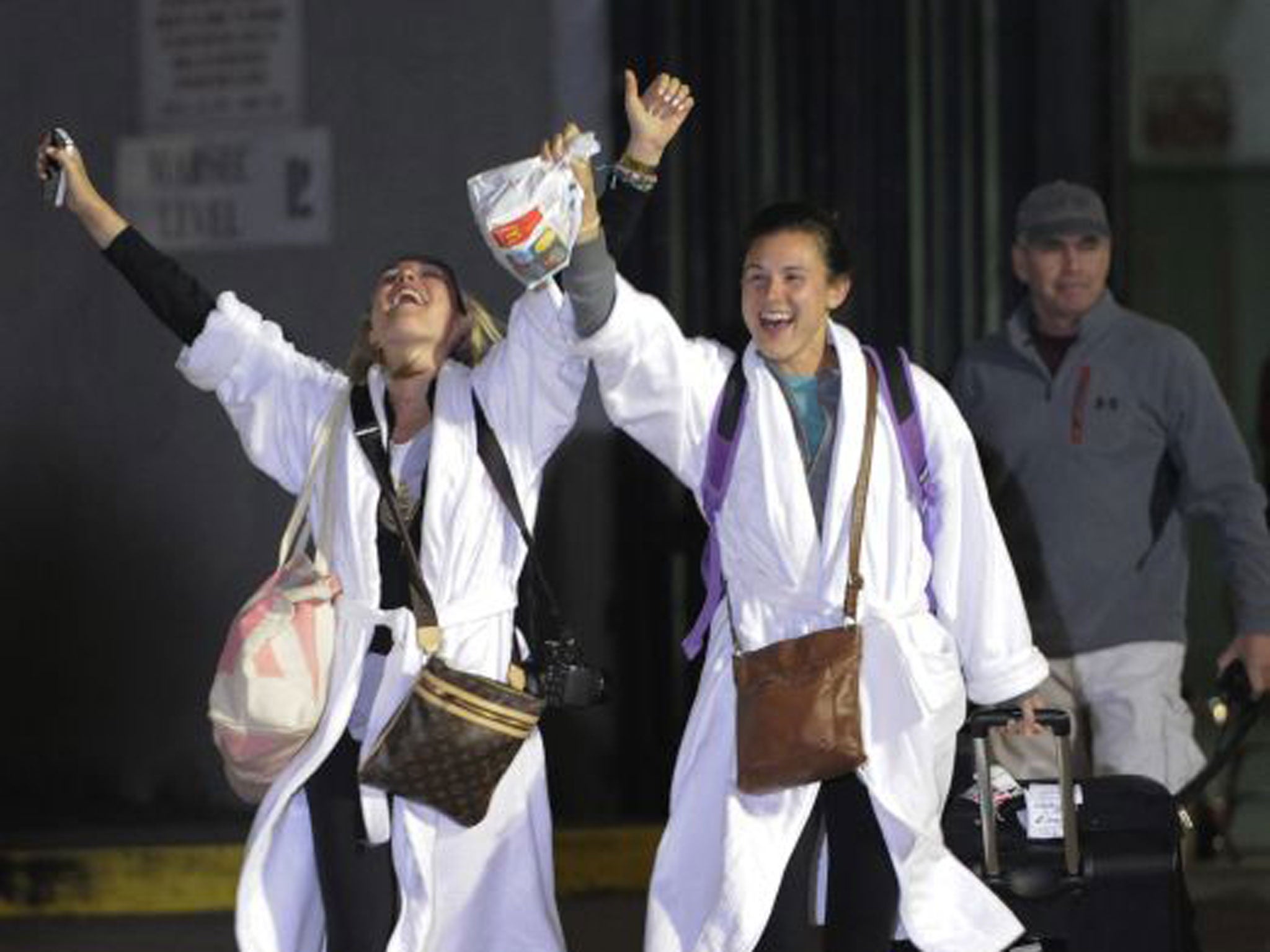 Passengers, some clad in bathrobes to keep warm, cheered and kissed the ground as they emerged from a high deck of the Triumph before being crammed into buses to take them to New Orleans or back to Galveston, where their ill-fated cruise had started last Saturday, for the final leg of their journeys home.