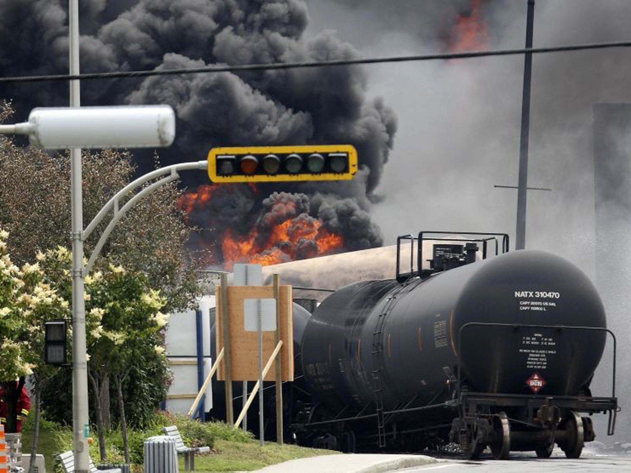 The train of 73 cars came off the rails just after 1am local time (05:00 GMT), and it is reported that four tanks full of petrol blew up, sending flames hundreds of feet into the air.