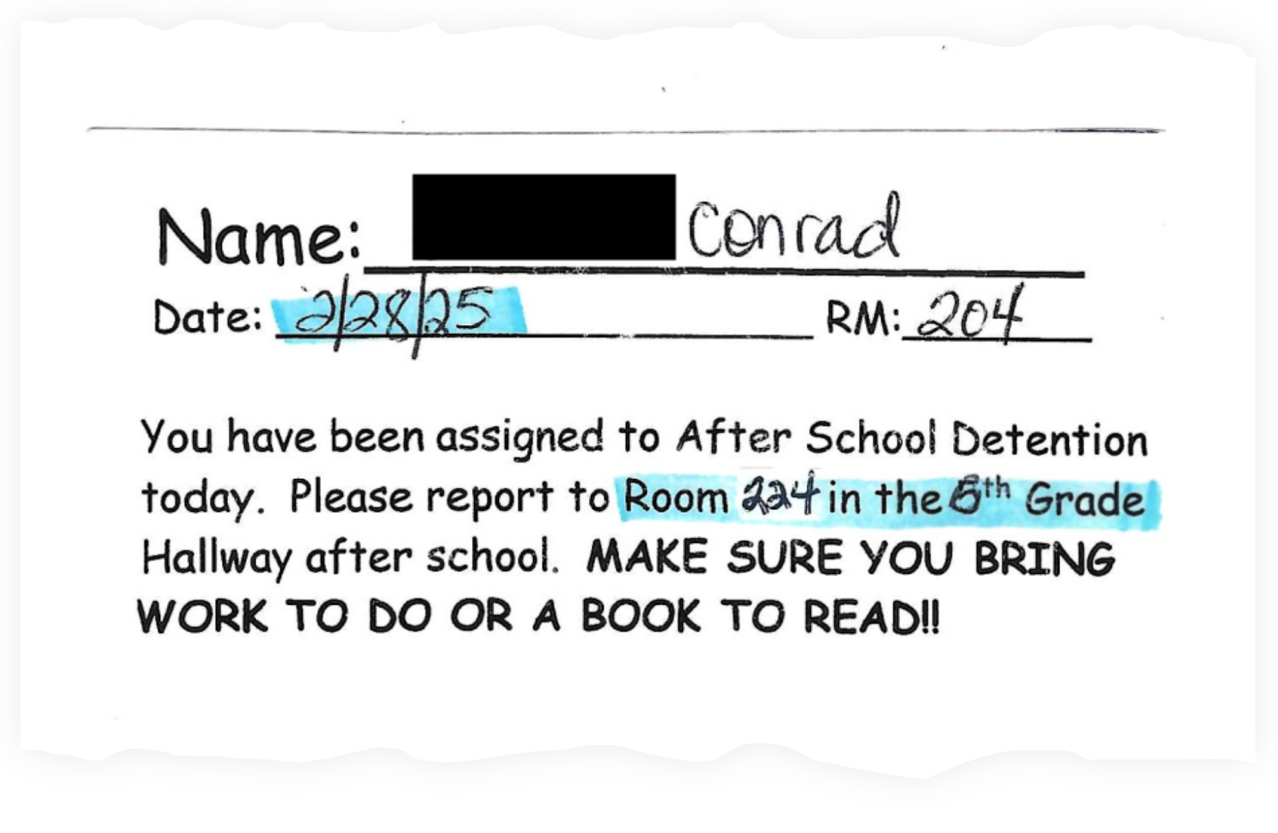 On March 24, C.C. once again wore the “Let’s Go Brandon” T-shirt to school, contrary to Kepple’s warning, according to the complaint. When Ferini spotted it, she contacted Kepple, who summoned C.C. to his office, the complaint states. Kepple told C.C. that he would be sent to after-school detention for violating the rules, it says. C.C. was “punished” twice more during March “for the content of his ‘Let’s Go Brandon’ T-shirt,” according to the complaint, which alleges, without providing specific examples, that the district “allow[s] many other different expressions and speech on student’s clothing, at school, including political speech.” (A detention slip filed in court as an exhibit displays a February 2025 date; no explanation is given for the discrepancy.)