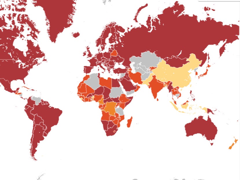 The travel advice map is predominantly red, with more than 120 countries with “high risk” warnings. Red countries include those with more than 500 Covid cases per 100,000 people over the last 28 days.