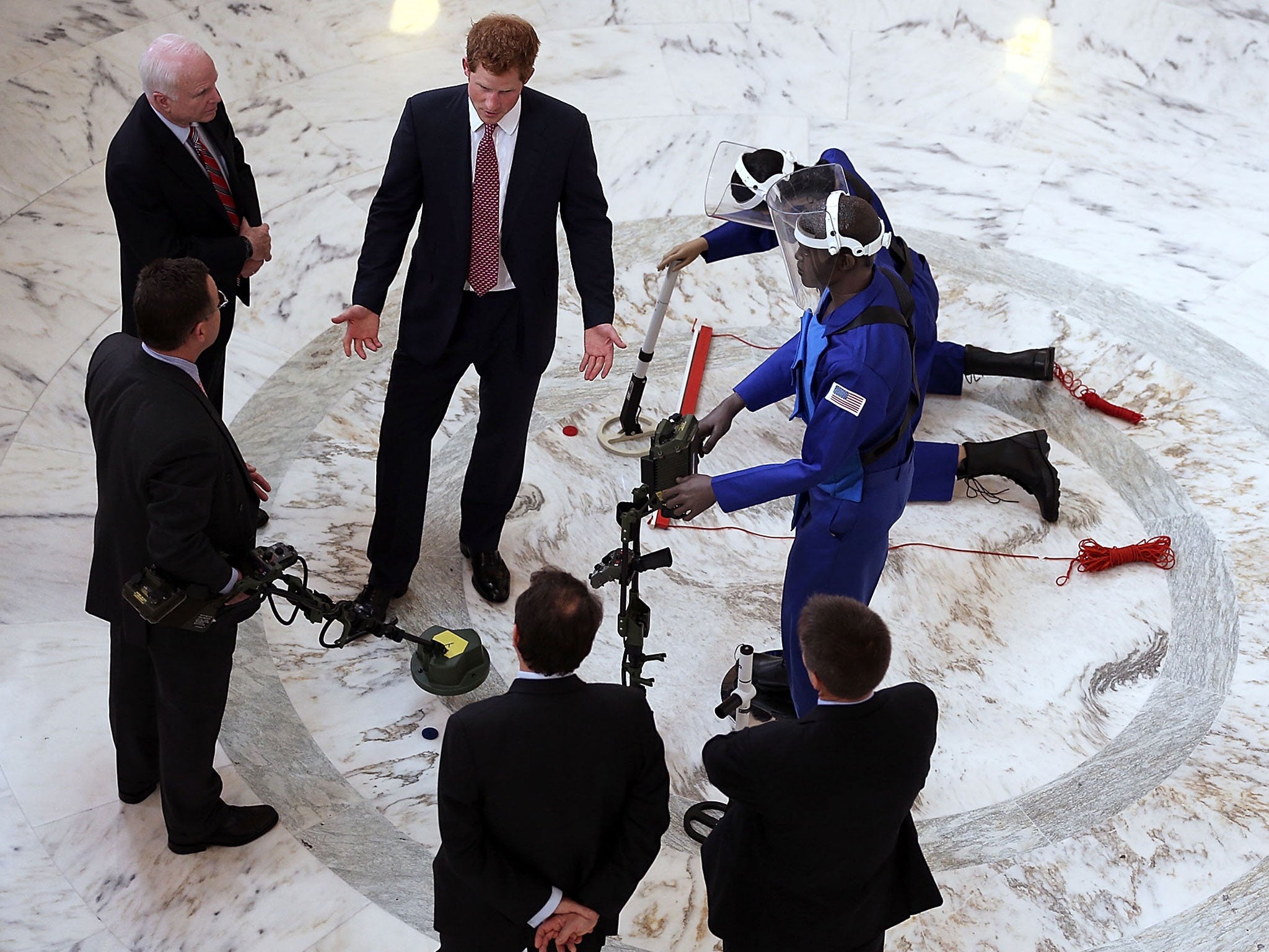 Earlier in the day hundreds of screaming girls gave Harry a deafening welcome when he arrived at the Russell Senate Office building on Capitol Hill for a photographic exhibition highlighting the work of the Halo Trust.