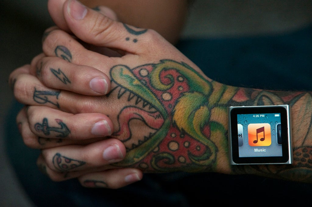 Hurban, 21, who works in a tattoo parlor in Newfield, New Jersey, implanted four metal studs in the skin of his wrist and secured his iPod to them magnetically.