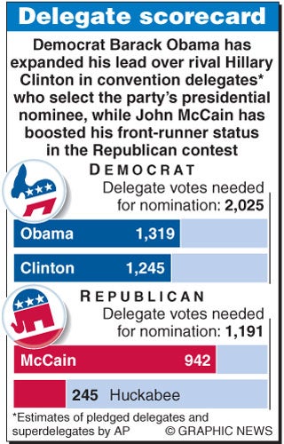 There is also the crucial matter of the nearly 800 super-delegates who may have the power to tilt the balance in favour of one or the other of the runners if they remain essentially tied at convention time. Both camps have been wooing them feverishly. But Mr Obama can expect to have an easier time winning their loyalty as he chalks up new victories across the country.