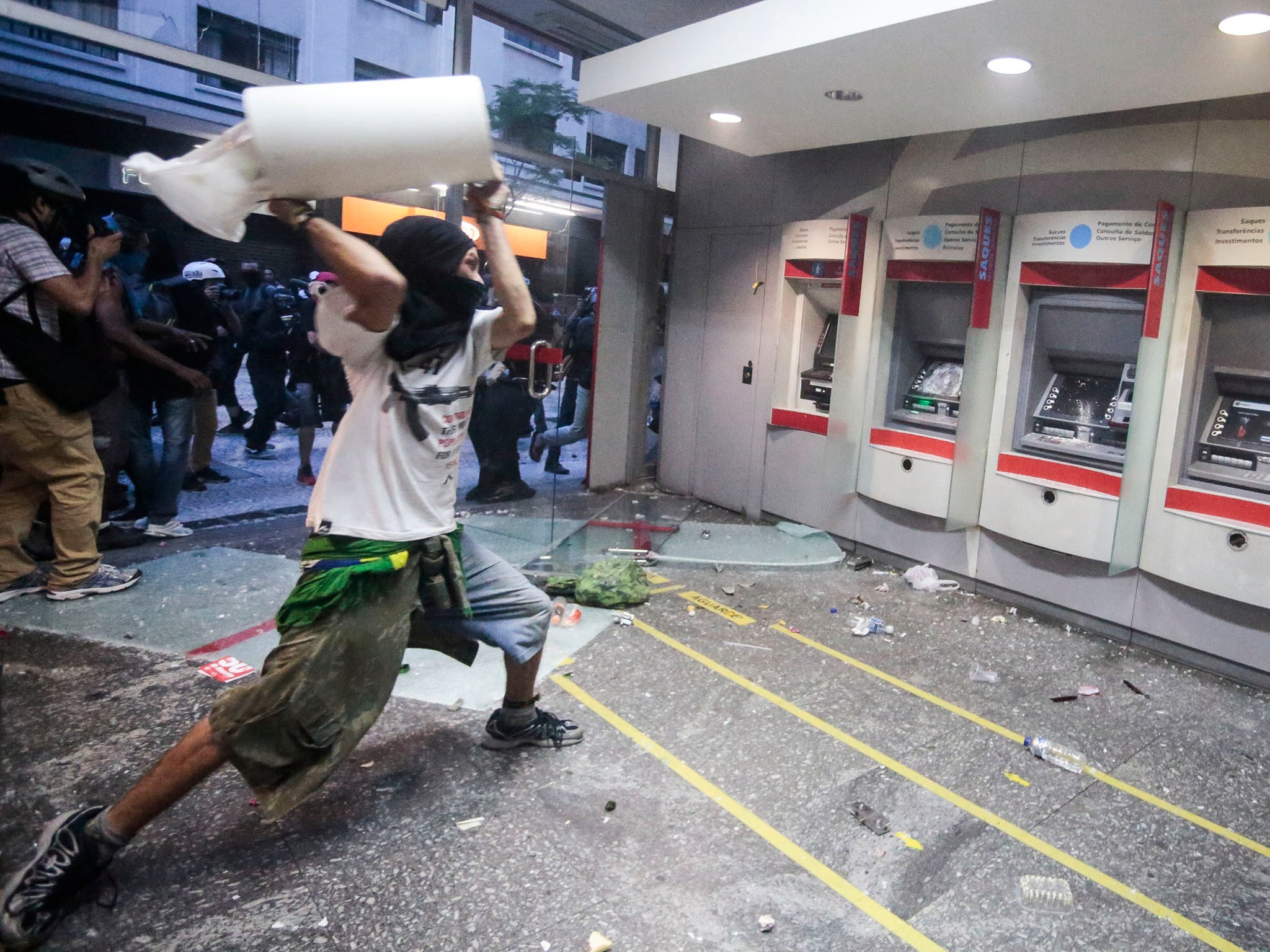 Sao Paulo demonstration billed as the year’s first action against the summer tournament ended in tear gas and rubber bullets after cars were torched and bank windows smashed