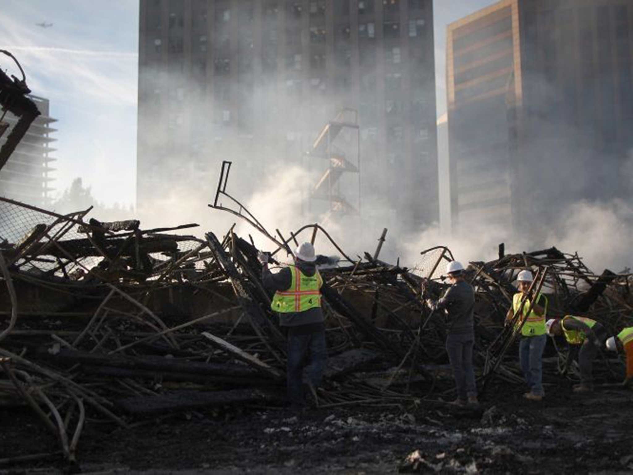 Photographs emerging from Downtown Los Angeles show the building as a collapsed ruin after the blaze, which saw 250 firefighters battling the flames yesterday with many still on site dealing with smoldering debris.