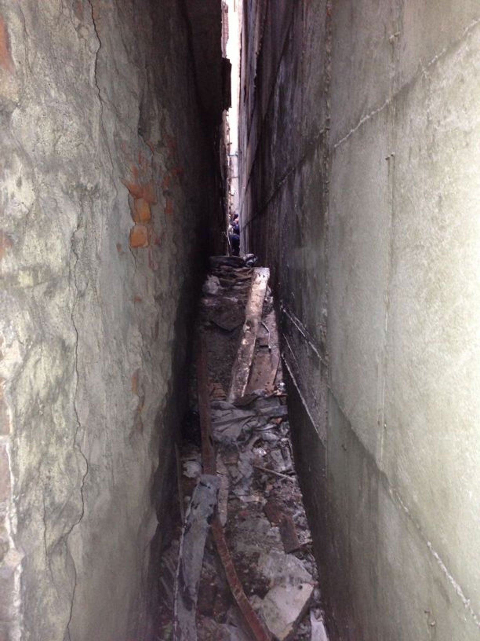 Kelly edged down the narrow passageway to look at the object on Friday evening, noting there is also a piece of rope intertwined with the part in what looks like a broken pulley that may have come down from the roof of the site of the planned Islamic community centre, at 51 Park Place.