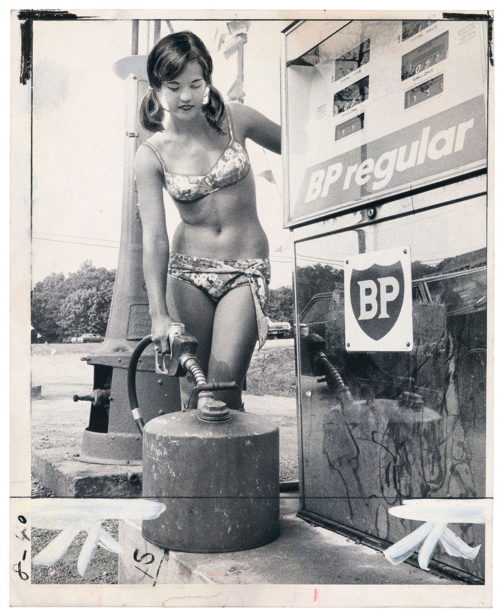 The woman, it turns out, is waiting in line for the pumps in Baltimore during an oil shortage. But the photo is also enigmatic in that it's marked with red lines. These reveal its function – this isn't an art print, but a press photo, used in a newspaper story about gas shortages, then placed in an archive. Those markings indicate how it should be cropped.