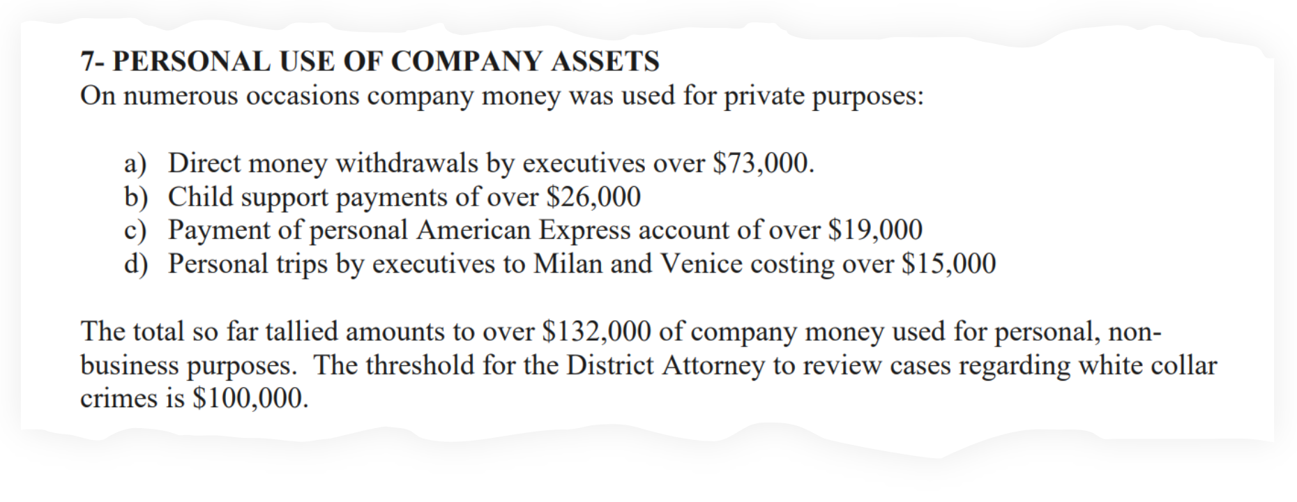 “There were numerous expenses that were of personal and private nature,” the exhibit states. “For example, spending the Saturday night of 1/7/24 in one of the romantic suites in Villa Onofria in Brescia, Italy, right at the banks of Lake Garda [must have been] magical.”