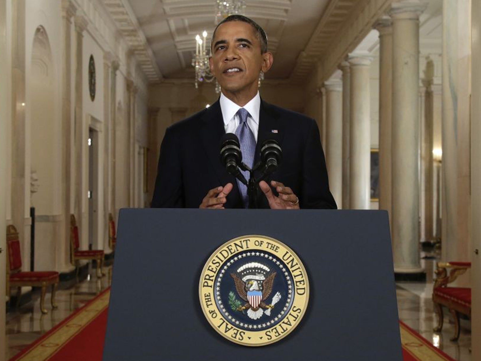 In his long-anticipated address to the nation from inside the White House, Mr Obama asserted that it had been the credible threat of US action that had in part precipitated the dramatic diplomatic activity of the last days springing from a Russian initiative requiring that the Syrian government hand over the chemical arsenal for dismantlement.