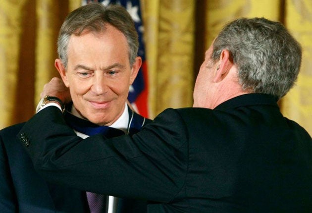The praise was generous and the applause long and heartfelt, in the ceremonial East Room of the White House where once Messrs Bush and Blair held defiant joint press conferences in defence of their war in Mesopotamia. "He understood the stakes in the war on terror," the President enthused, at one point seeming to wink in his guest's direction. "Tony Blair's entire career has been defined by his devotion to democratic values and human dignity. At his very centre this man believes in freedom."