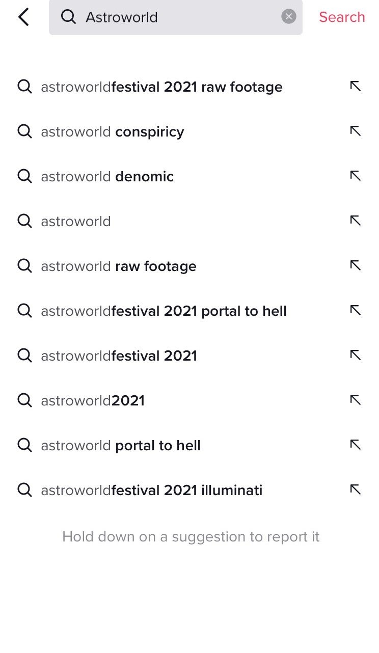 But on Wednesday the app’s own algorithms were still spreading such material, with five of the top ten suggested search queries for "Astroworld" relating to conspiracy theories on The Independent’s device.