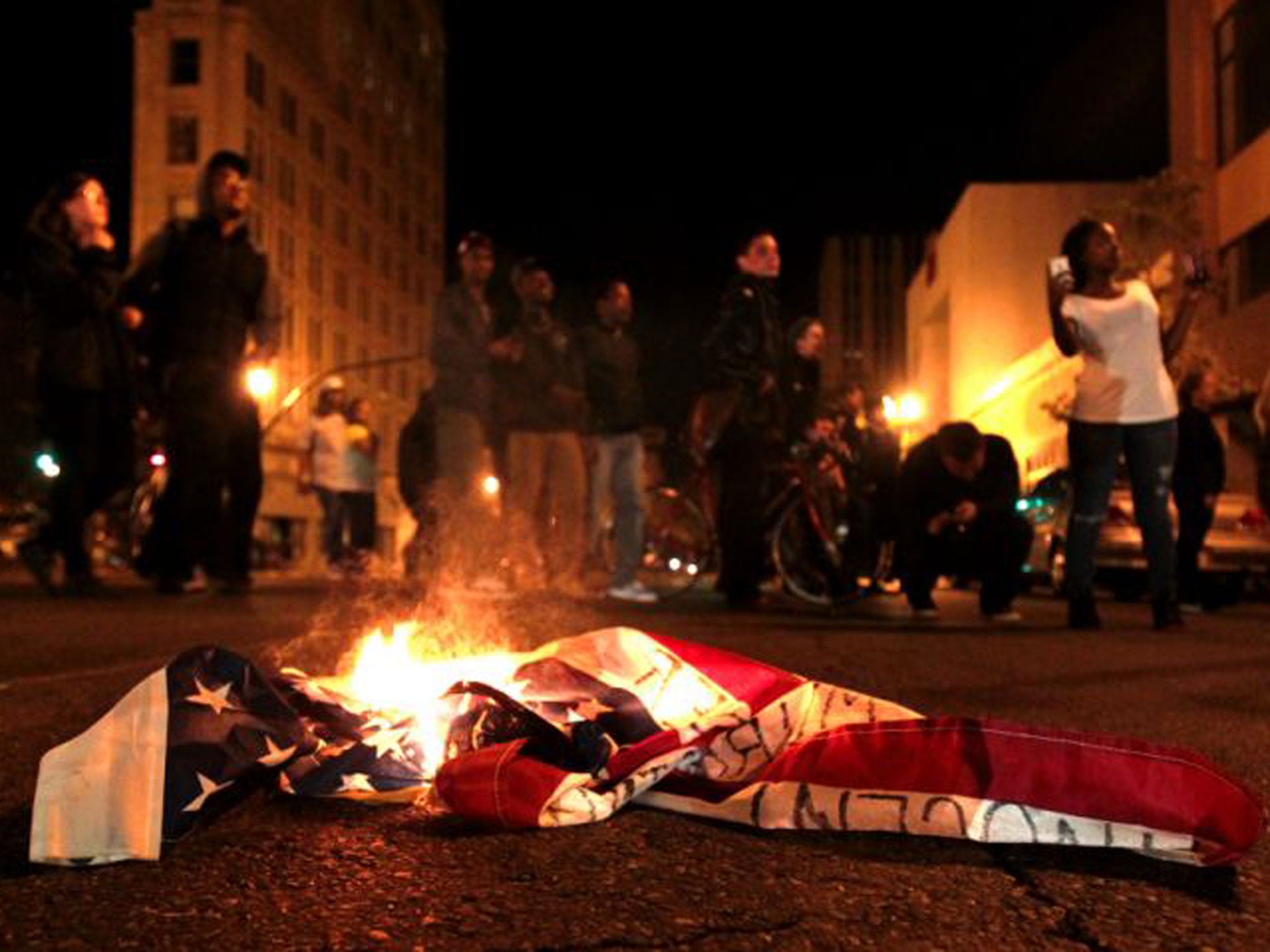 As dawn broke the riots feared by the police had failed to materialise, but peaceful protests had been reported as far afield as Washington, New York, Chicago, Philadelphia, Atlanta and San Francisco. In Los Angeles, around 200 demonstrators gathered for a vigil in one of the city’s African-American neighbourhoods, Leimert Park. Police in Oakland, California, said a small crowd took to the streets, with some breaking windows, spraying anti-police graffiti and burning US and California state flags. No arrests were made.