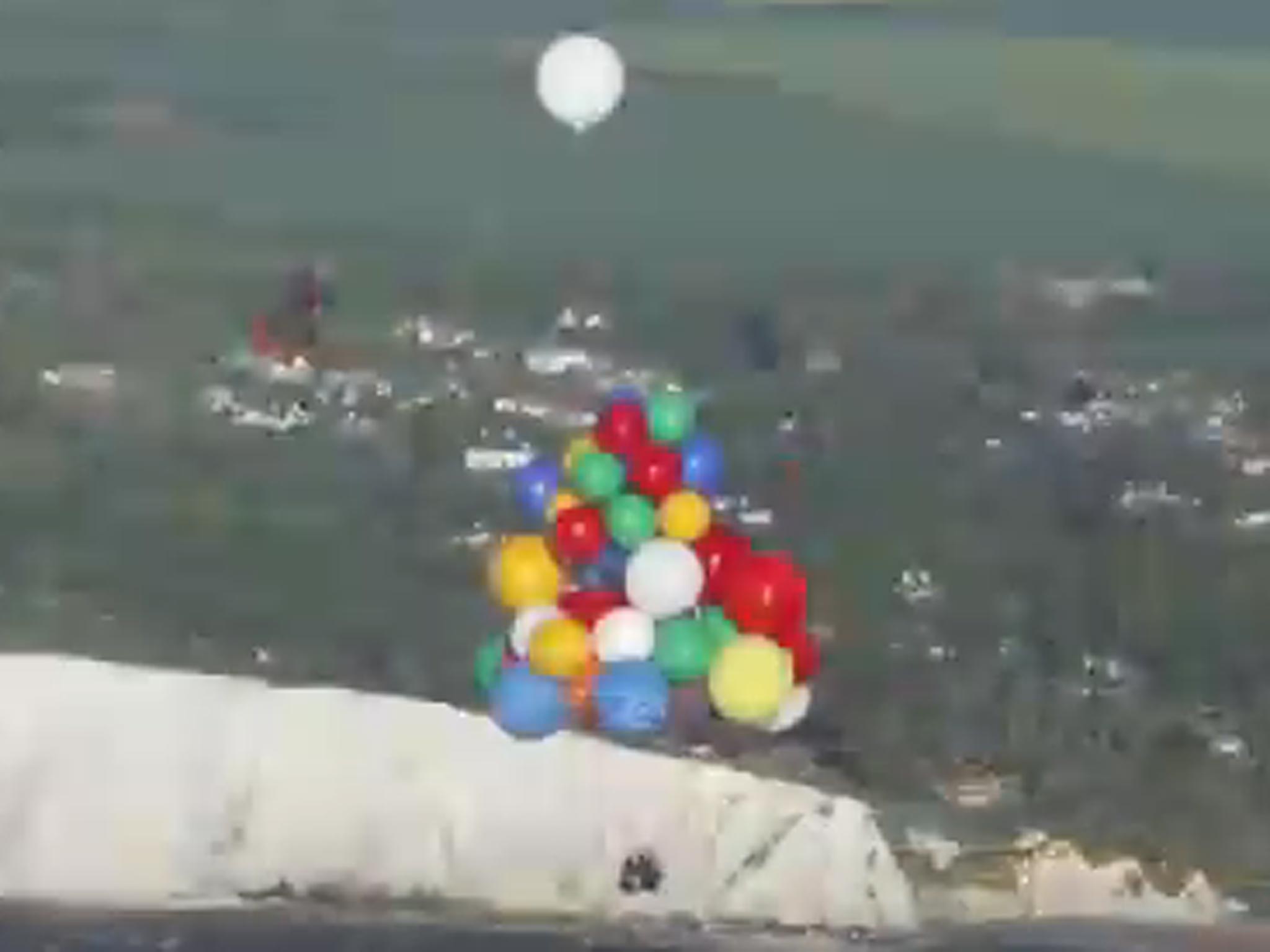 In scenes reminiscent of Disney film Up, Jonathon Trappe took off in Caribou, Maine on Thursday amid heavy fog whilst in a lifeboat attached to 370 helium filled balloons.