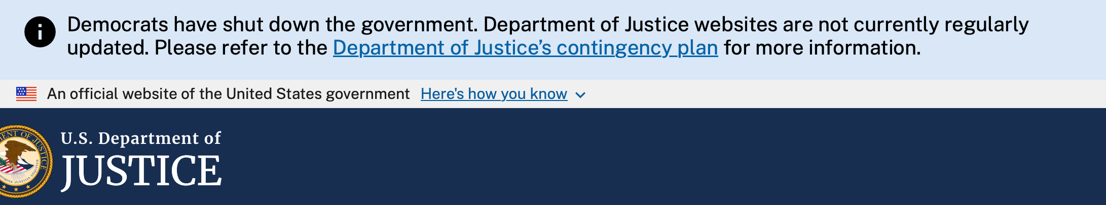Another message at the top of the Department of Justice website says “Democrats have shut down the government.”
