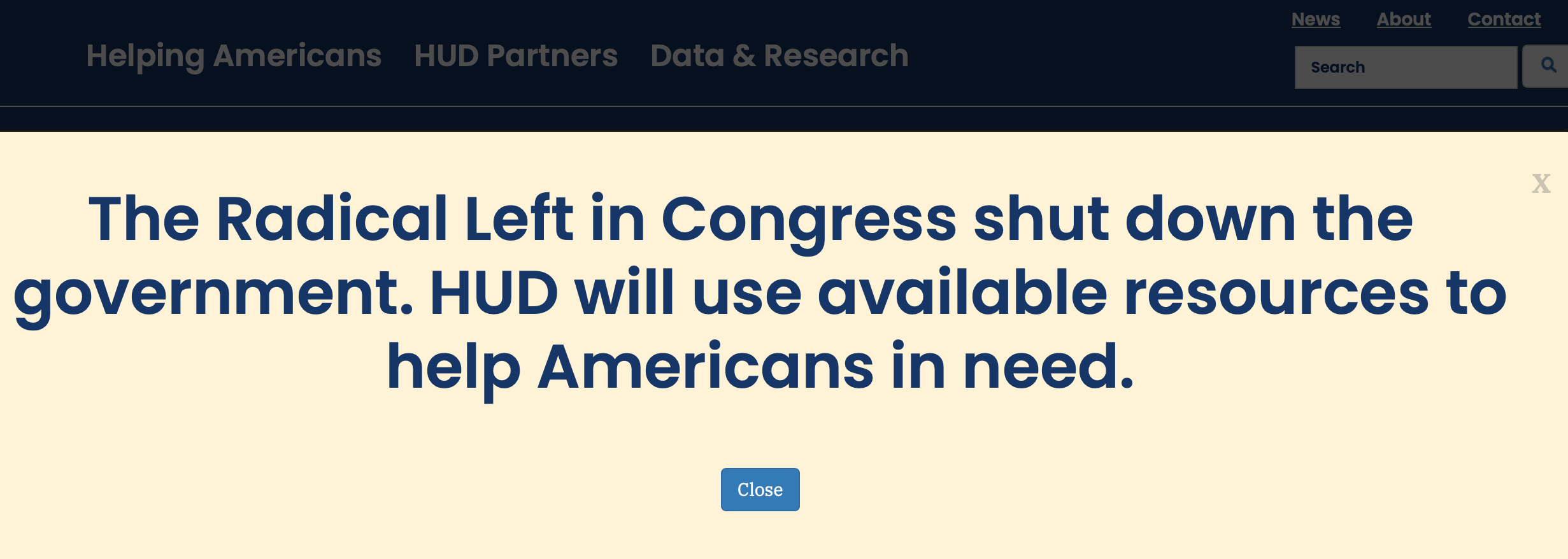 “The Radical Left in Congress shut down the government,” according to a large pop-up message and a bright red banner on the Department of Housing and Urban Development’s website.