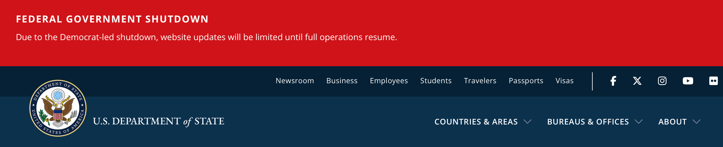 “Due to the Democrat-led shutdown, website updates will be limited until full operations resume,” according to a red banner on the State Department’s website.