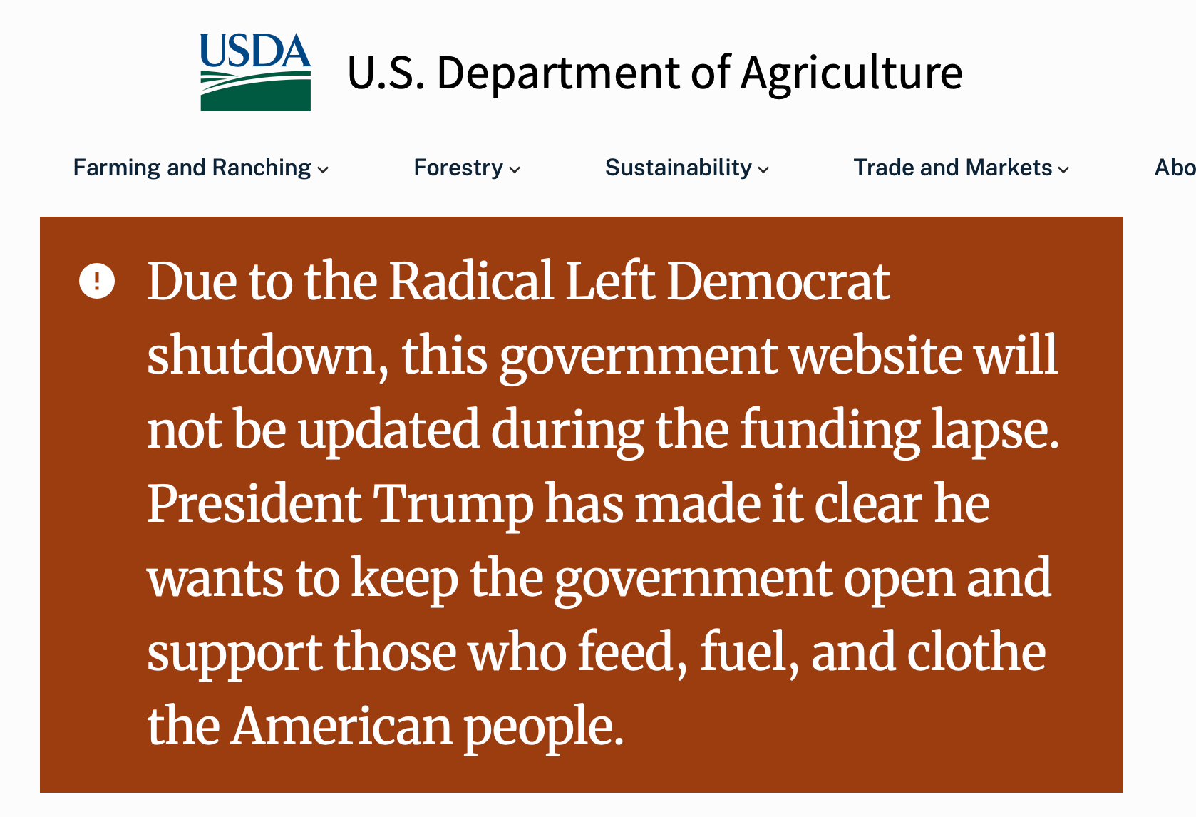 A massive brown banner on the Department of Agriculture website reads: “Due to the Radical Left Democrat shutdown, this government website will not be updated during the funding lapse. President Trump has made it clear he wants to keep the government open and support those who feed, fuel, and clothe the American people.”