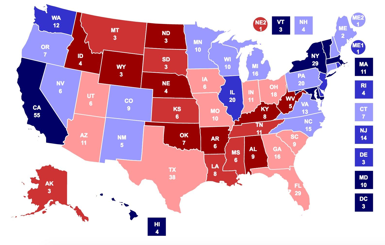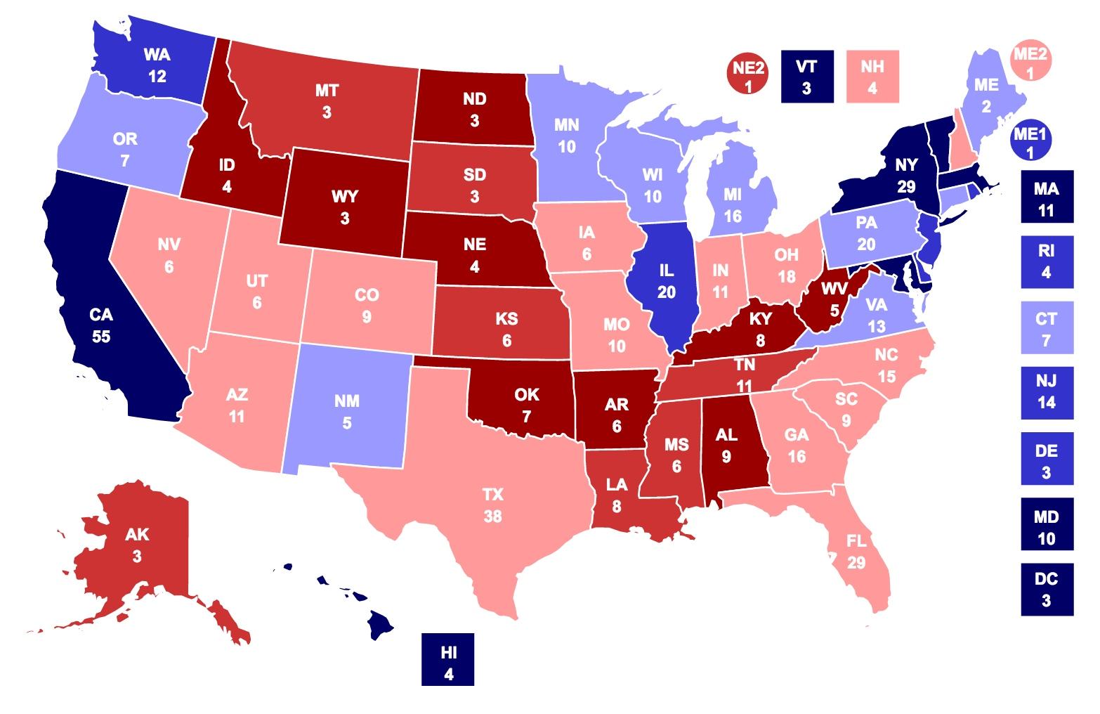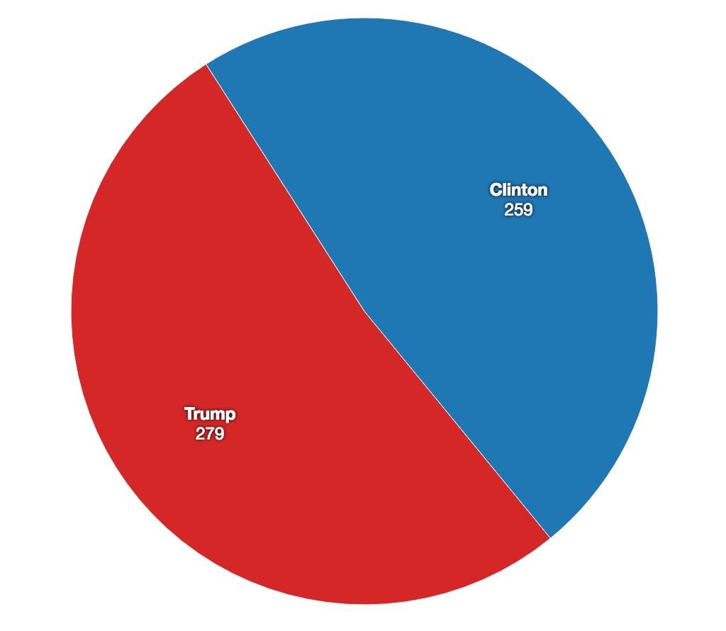 Based on these states alone, the Democrats have a sizeable lead of 259 electoral votes to the Republicans’ 164.