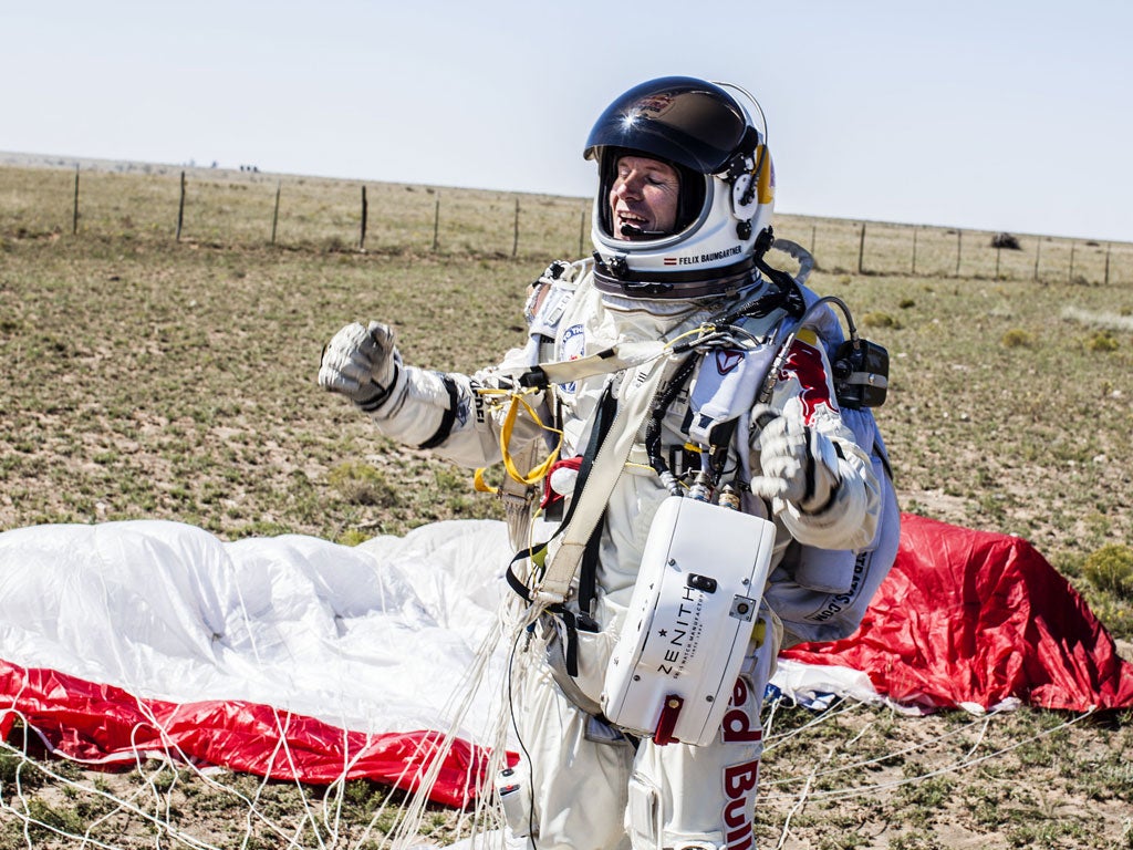 A second hiccup, when his facemask began to steam up, helped persuade Baumgartner to open his parachute after 4 minutes 22 seconds. That was slightly earlier than planned, meaning he did not break the world record for longest freefall. He nonetheless achieved the highest skydive in history, and become the first skydiver to break the sound barrier, hitting 834mph. “I didn't feel the sonic boom,” he said. “I think it happens behind you.”