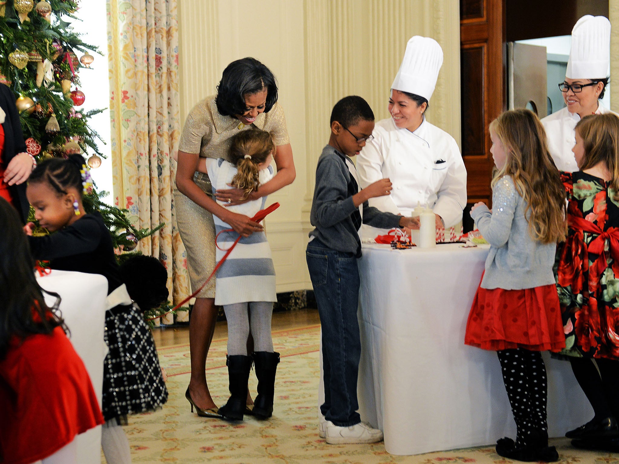 Obama, dressed in a gold Lurex jacket by Michael Kors and pencil skirt that she repurposed from her own closet, then led the kids into the normally staid State Dining Room to create holiday crafts. Under the watchful eye of Abraham Lincoln, youngsters heaped glitter glue onto pomegranate ornaments, making souvenirs to take home, and dipped White House honey tea lollipops into candied beets, celery and fennel. "Try not to glue and lick at the same time," Obama cautioned them. "Everything is not edible."
