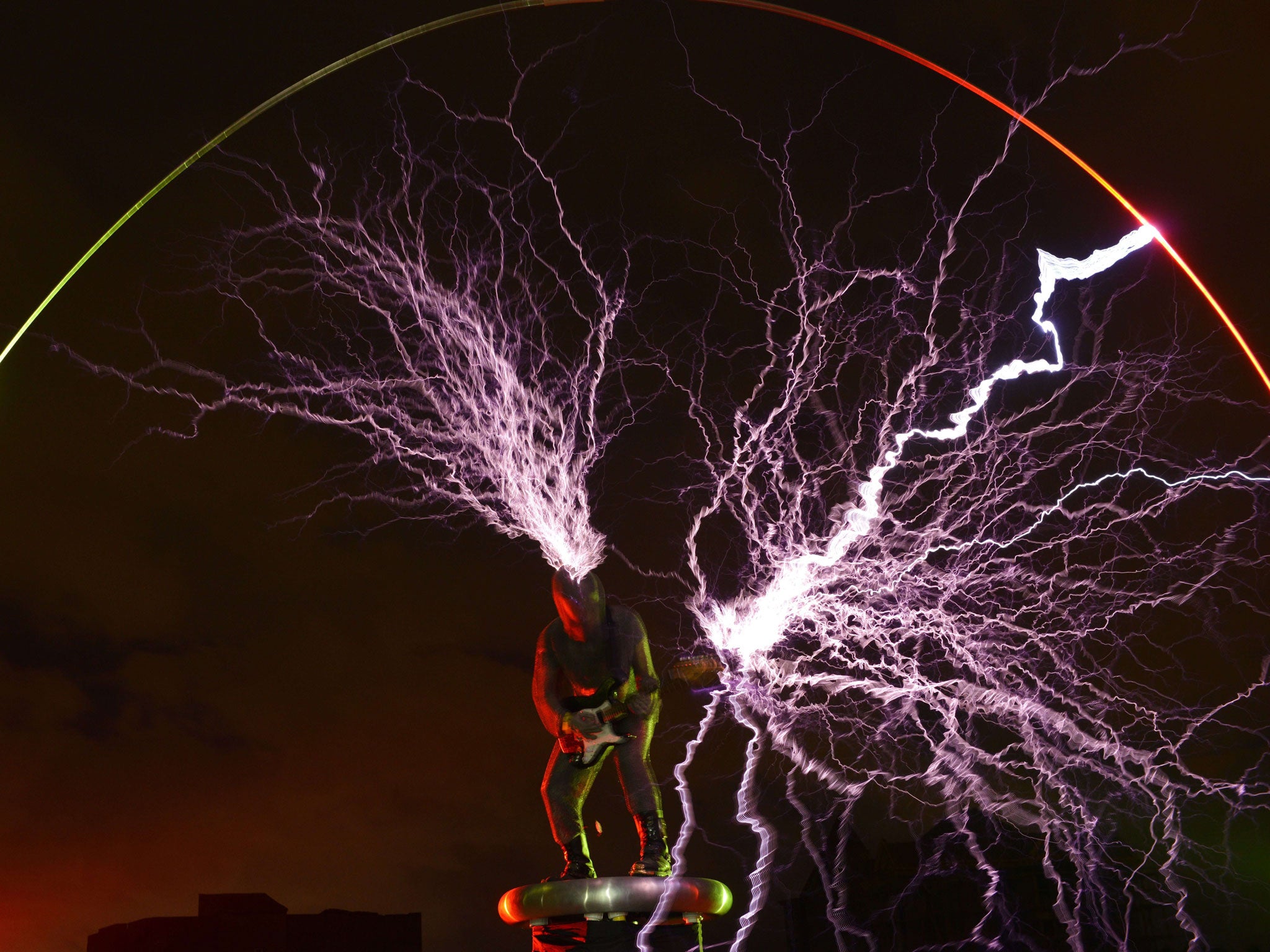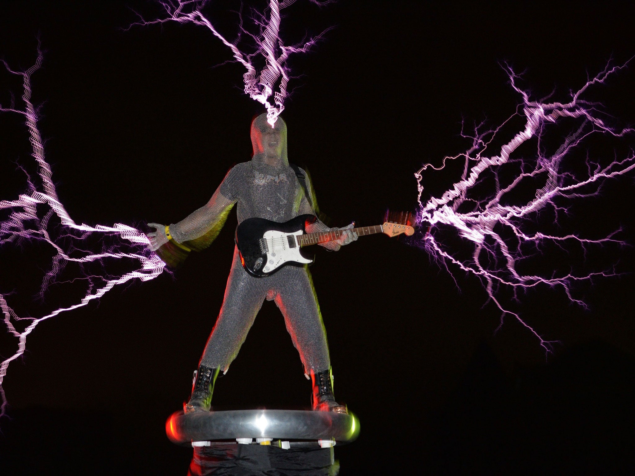 Lightningfan, a ten-piece band, perform on Tesla coils which generates huge bolts of electricity and looks visually stunning. The band play in ferroalloy metal suits in order to avoid being electrocuted in the process.